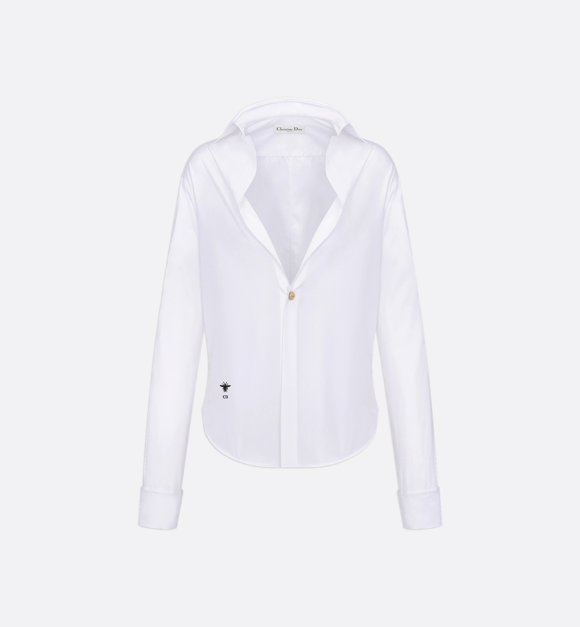 Revelada no desfile Outono-Inverno 2024-2025, esta blusa é uma criação elegante e moderna. Confeccionada em popeline de algodão preta leve, ela tem corte normal, decote profundo e punhos adornados com um botão dourado com a inscrição Christian Dior Paris em estilo retrô. Fiel ao espírito do desfile, a blusa pode ser combinada com uma minissaia da coleção para compor um look elegante.