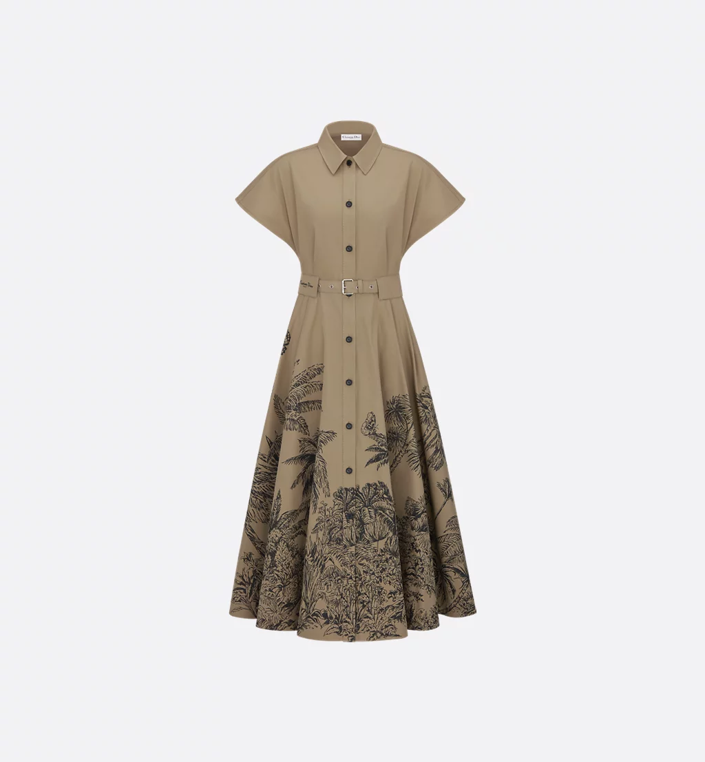 Parte da coleção cápsula Dioriviera, o vestido chemise midi exibe a estampa Toile de Jouy Palms preta de Pietro Ruffo, capturando a beleza da natureza com uma vibrante cena de selva povoada por uma fauna diversificada. Confeccionado em gabardine de algodão bege, apresenta uma silhueta evasê realçada por um fechamento com botões e pregas, enquanto um cinto no mesmo tom e a assinatura Christian Dior Paris destacam delicadamente a cintura. O vestido com mangas curtas pode ser coordenado com outras criações da coleção cápsula Dioriviera.