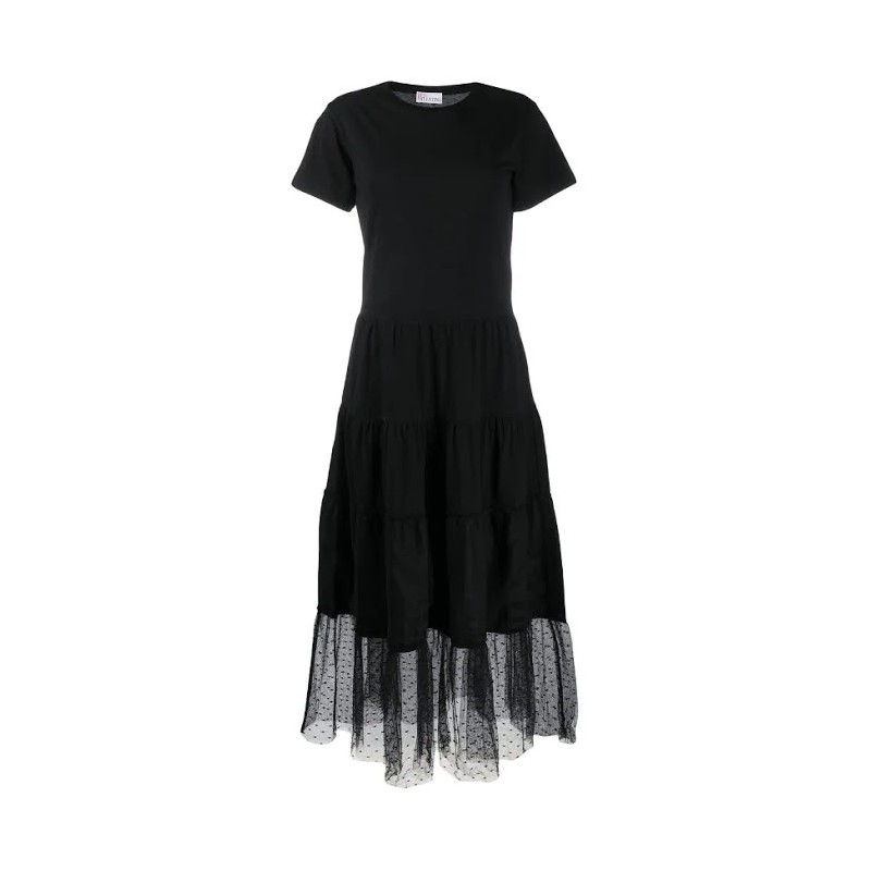 Red Valentino, vestido em malha de algodão preto com detalhe em renda no barrado, manga curta, gola redonda