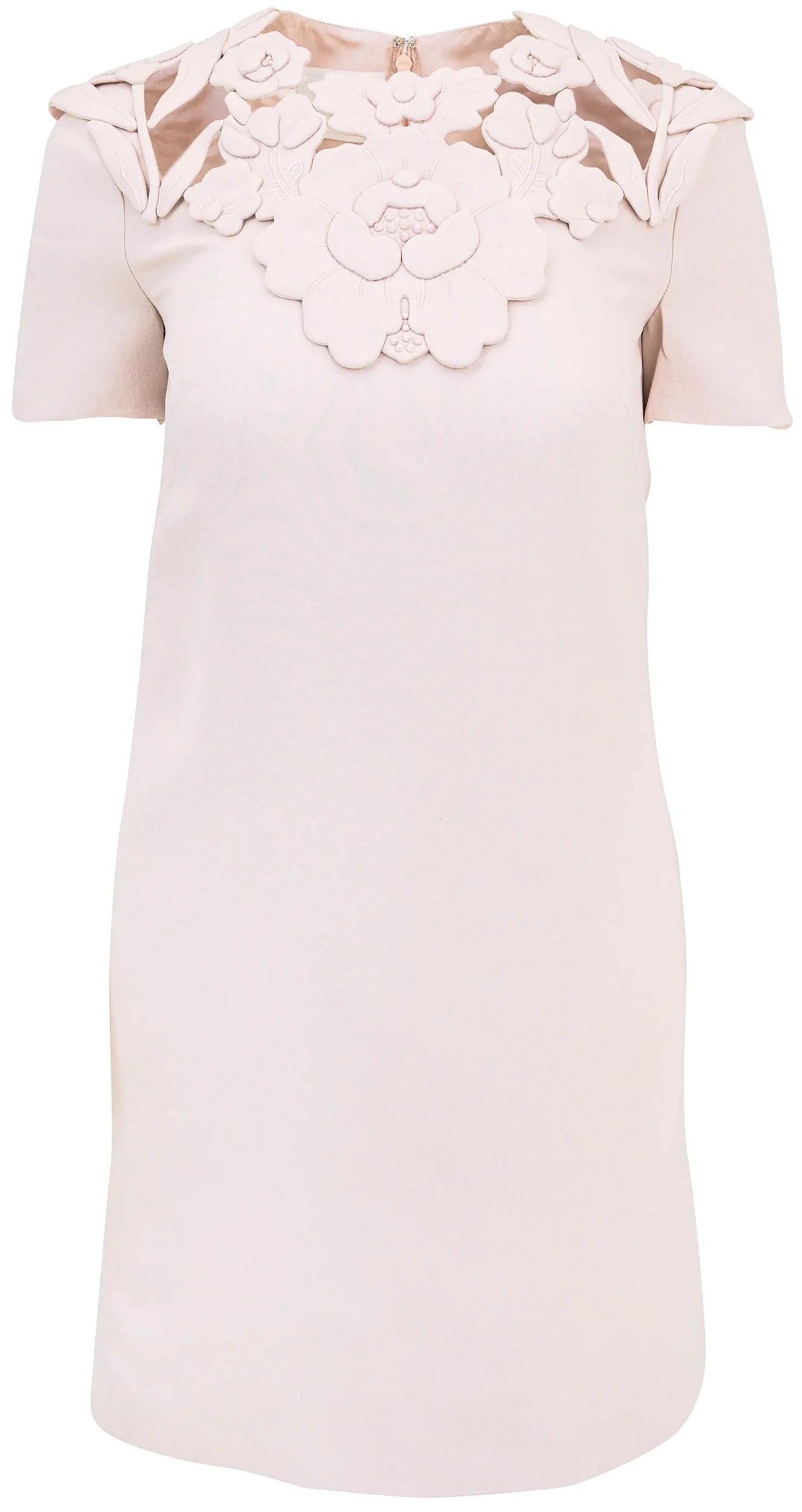 Vestido curto feminino Valentino Garavani com bordados florais na parte frontal do pescoço e ombros, perfeito para quem busca elegância com detalhes exclusivos.